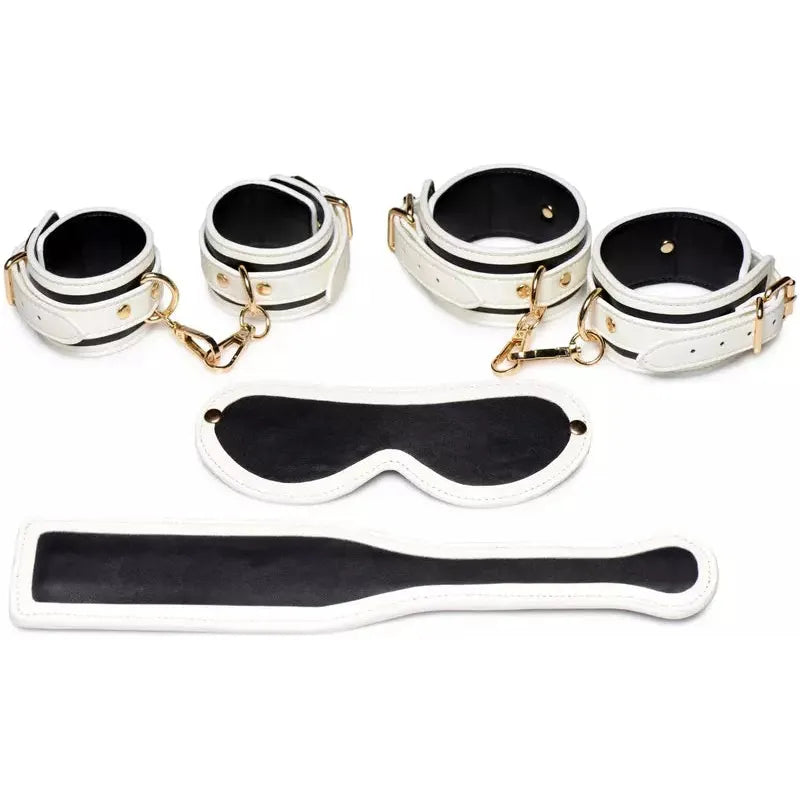 The included arm warmers, paddle, and headband are attractive white and gold in the light, but transform into glowing kink tools so you can play in dimly lit scenes with ease.